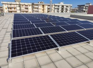 Sono funzionanti da qualche giorno 64 pannelli fotovoltaici installati sulla sede comunale di Lama Scotella. L’impianto da 19.200 kWp (kilowatt picco) permetterà un risparmio del 20% del fabbisogno energetico degli uffici comunali di Via Martiri di Via Fani e sarà ammortizzato in meno di 8 anni.