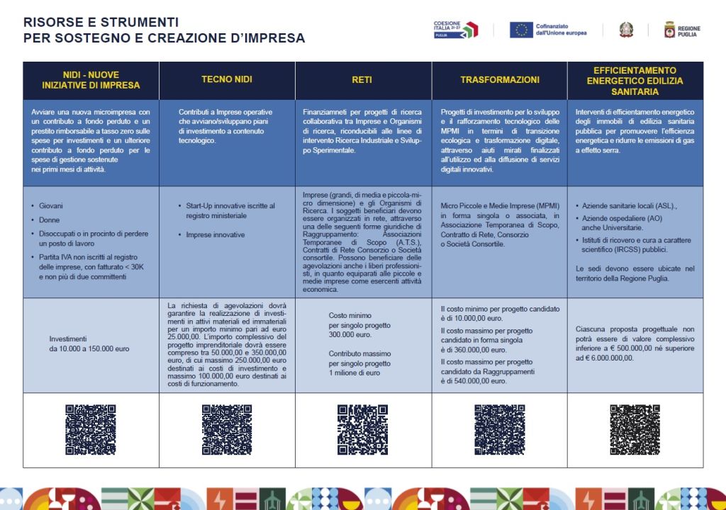 Il Dipartimento Sviluppo Economico della Regione Puglia ha emanato molteplici bandi volti a intercettare le esigenze del tessuto produttivo e della ricerca e a dare impulso al sistema economico e imprenditoriale.
