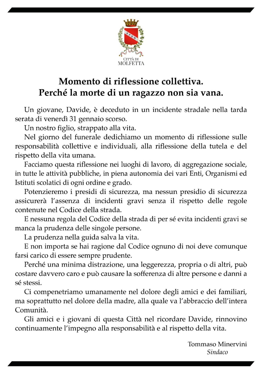 Gli amici e i giovani di questa Città nel ricordare Davide, rinnovino continuamente l’impegno alla responsabilità e al rispetto della vita.
