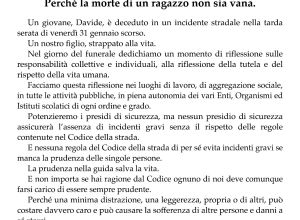 Un giovane, Davide, è deceduto in un incidente stradale nella tarda serata di venerdì 31 gennaio scorso. Un nostro figlio, strappato alla vita.