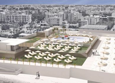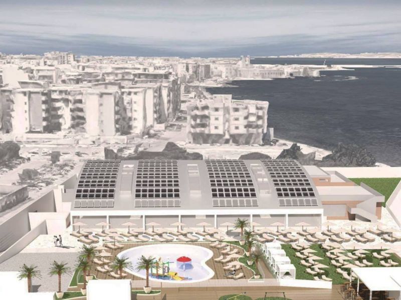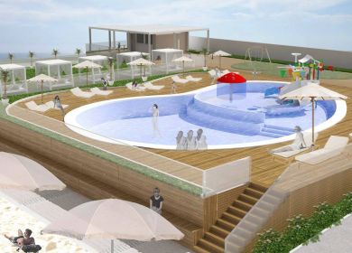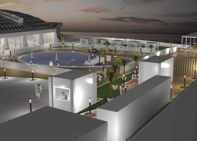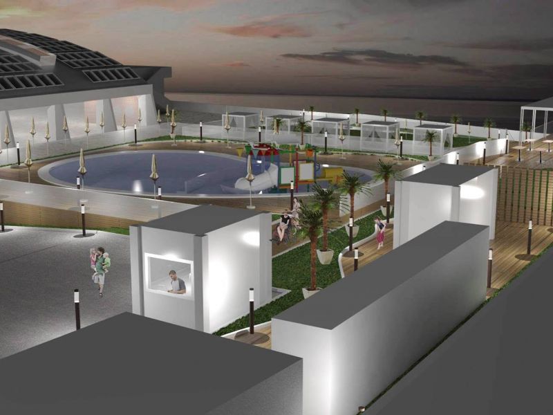 RIQUALIFICAZIONE DELL’AREA ESTERNA Nel tempo l'area ha subito diverse modifiche, come ad esempio, la sostituzione dell'area di servizio esterna in un'area in cui venivano installati degli ombrelloni su un sottofondo di ghiaia. Si rende perciò necessario il ripristino dell'area di servizio esterna, rispettando la normativa in tema antincendio. L'area incolta, al cui interno era disposto un campo di beach volley, verrà riqualificata attraverso la realizzazione di una pavimentazione in legno amovibile, la quale abbraccerà una piscina scoperta, anch'essa amovibile. Tutte le superfici previste eliminano le barriere architettoniche, rendendo la nuova area totalmente accessibile ai diversamente abili ai sensi del D.M. 14 giugno 1989 n. 236. Inoltre, la nuova area disporrà di idonei dispositivi e sistemazioni antincendio, nel rispetto della vigente normativa. La costruzione di una nuova vasca ludica scoperta creerà una zona perimetrale di qualità e di interesse pubblico, poiché si rivolge alla comunità in modo da garantire un servizio che permettere di utilizzare gli spazi non solo dell'impianto natatorio esistente, ma anche di una zona destinata al relax e allo svago. L'area circostante la piscina sarà arredata con sedute, divanetti, ombrelloni, piccoli gazebi, poltrone, vasi e piante, in particolare palme, e quant'altro occorrente per rendere l'area completa e fruibile agli ospiti. È inoltre previsto un chiosco-bar, servizi igienici e docce a disposizione degli ospiti, spogliatoi e una biglietteria. L'intera progettazione dell'area esterna è stata concepita con i caratteri di amovibilità, per permettere lo smontaggio di tutta la struttura al termine del periodo estivo. Tale intervento fornirà un ulteriore comfort per i visitatori, oltre a riassegnare all’area in questione una forte valenza paesaggistica.