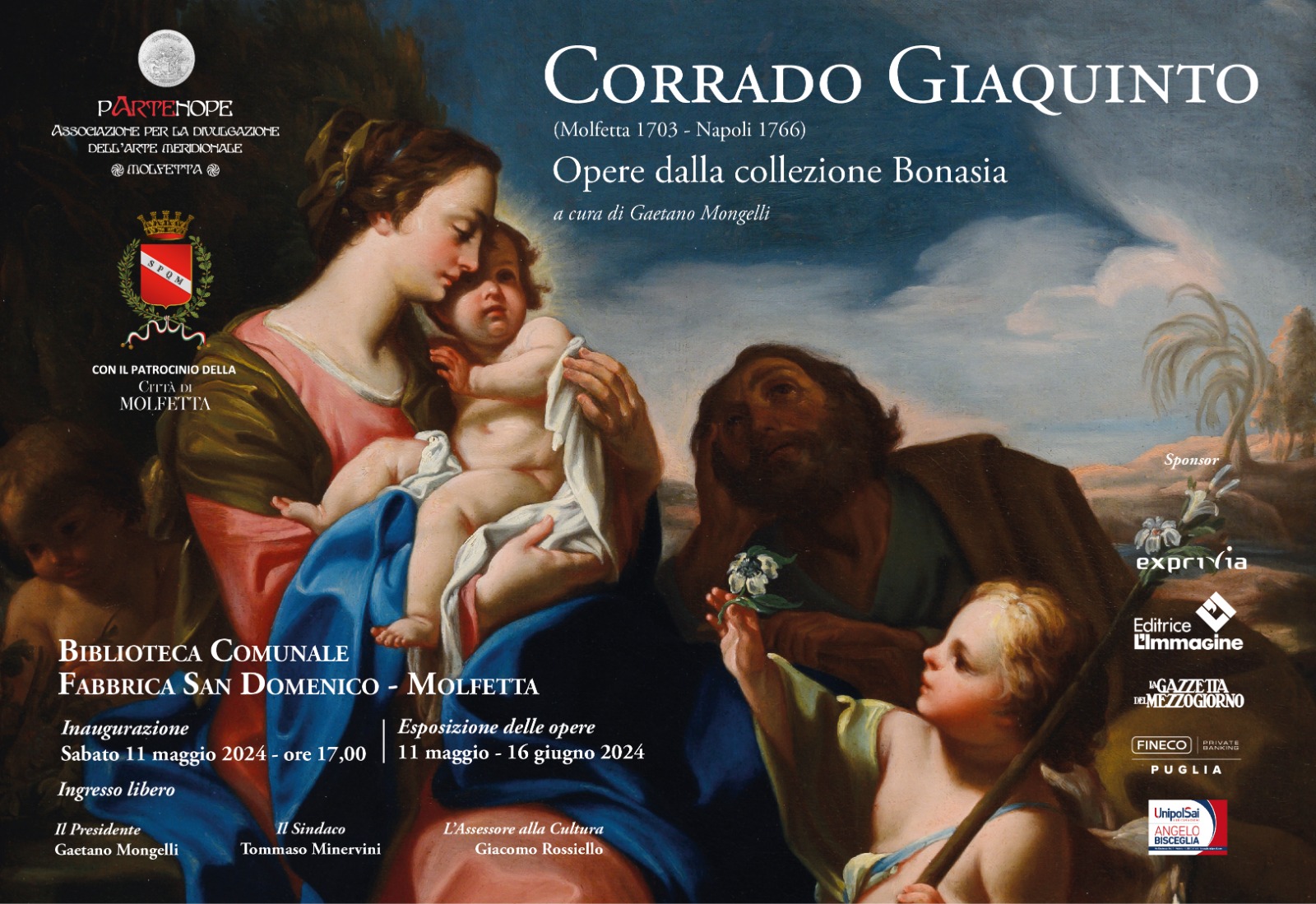 In mostra opere di Corrado Giaquinto, tra i protagonisti della storia dell’arte del Settecento europeo; e del suo maestro, Francesco Solimena, una delle più grandi figure nello sviluppo del barocco e del rococò. Tutte le opere provengono dalla Collezione Bonasia da tempo sono state acquisite in collezioni private sparse in Italia.