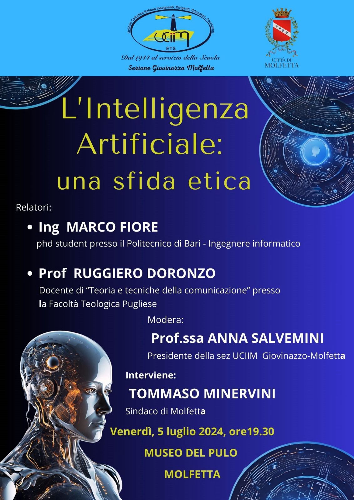 Per questo l’associazione UCIIM (Unione, Cattolica Italiana di Insegnanti, Dirigenti, Educatori e Formatori), riconosciuta dal MIM come ente qualificato per la formazione del personale della Scuola e riconosciuto ultimamente come ETS (Ente del Terzo Settore), ha voluto dar voce a queste perplessità attraverso un evento dal titolo: “L’Intelligenza Artificiale: una sfida etica” che si terrà venerdì 5 luglio 2024 alle ore 19:30 presso il Museo Civico Archeologico del Pulo.