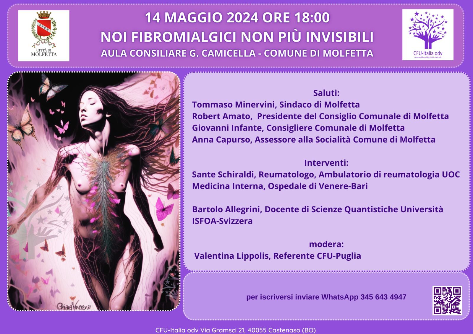 Martedì 14 maggio, alle 18, nell’aula consiliare Carnicella, a Palazzo Giovene, si terrà l’incontro “Noi fibromialgici non più invisibili”, oragnizzato dal Comitato Fibromialgici uniti, CFU, con il patrocinio del Comune di Molfetta.