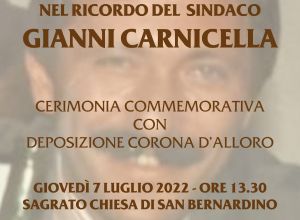 In ricordo del Sindaco Gianni Carnicella, giovedì 7 luglio, alle 13.30, cerimonia commemorativa ai piedi del sagrato della Chiesa di San Bernardino, nel punto esatto in cui il Sindaco, attinto da un colpo ravvicinato esploso con un fucile, si accasciò.