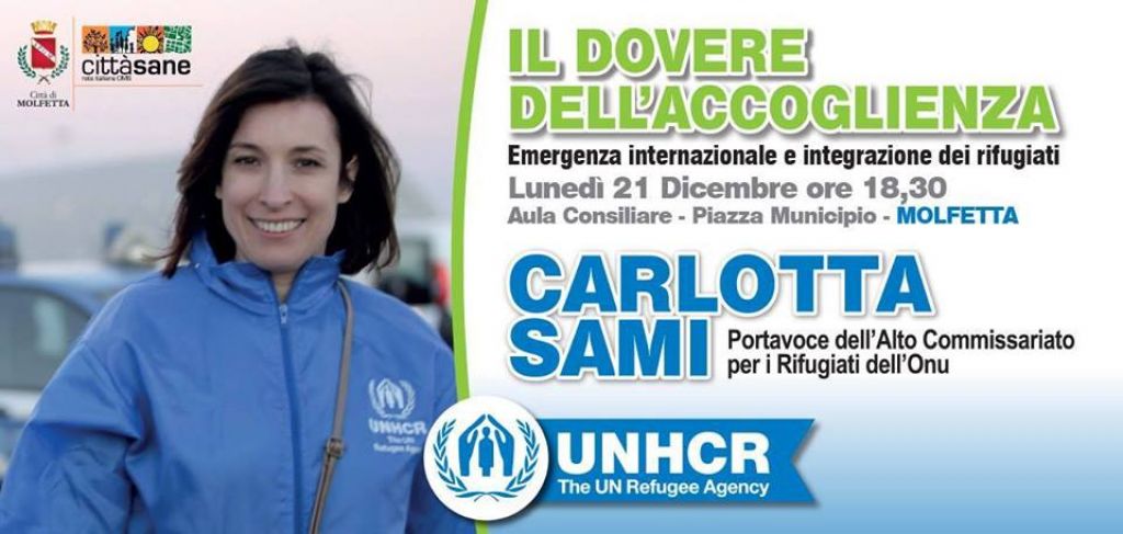 Lunedì 21 dicembre alle 18.30 nella sala consiliare di Molfetta interverrà Carlotta Sami, portavoce dell'Alto Commissariato delle Nazioni Unite per i Rifugiati - UNHCR Italia, nell'incontro dal titolo: "Il dovere dell'accoglienza. Emergenza internazionale e integrazione dei rifugiati", organizzato nell'ambito del programma Città Sane.