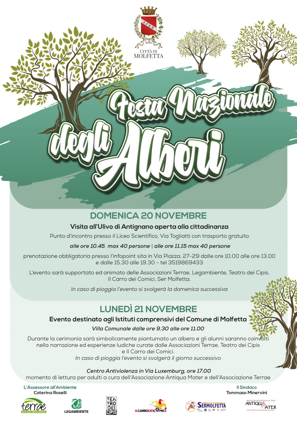 Domenica 20 novembre, a partire dalle 10.45, visita guidata per ammirare l’ulivo di Antignano, situato nell’agro di Molfetta, inserito negli elenchi degli alberi monumentali di Puglia; lunedì 21 novembre, in Villa Comunale, a partire dalle 9.30, piantumazione simbolica di un albero con la collaborazione della Multiservizi, alla presenza delle classi degli istituti Comprensivi di Molfetta, e, nel pomeriggio, presso il centro Antiviolenza “Annamaria Bufi”, in Via Rosa Luxemburg un momento di lettura.