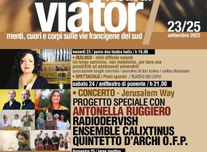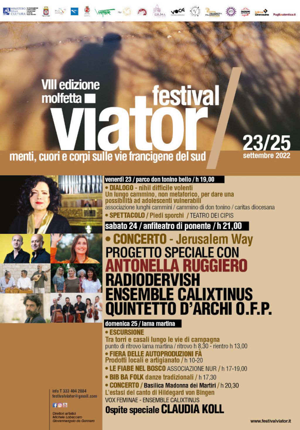 Sabato 24 settembre, presso l’Anfiteatro di Ponente, alle ore 21.00 (unico appuntamento a pagamento – biglietti acquistabili sul sito https://bit.ly/3PwPjBF o in loco) si continua con “Jerusalem way”, un invito al viaggio. A guidare il pubblico saranno le musiche di Antonella Ruggiero, dei Radiodervish e dell’Ensemble Calixtinus, in una sintesi creata apposta per il Festival Viator, con la collaborazione del Quintetto d’Archi della Filarmonica Pugliese.