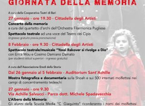 Sempre il 27 gennaio, alle 19.30, nella Cittadella degli artisti a cura della Cooperativa Teatri di Bari, Concerto della memoria a cura del Qartetto d’archi dell’Orchestra filarmonica pugliese e Spettacolo teatrale ad una voce di e con Corrado La Grasta a cura del Teatro dei Cipis, ingresso gratuito previa prenotazione presso l’Info Point al numero 351 986 9433.