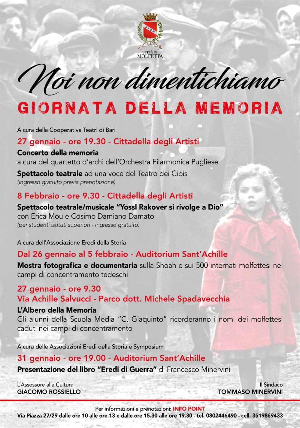 Sono racchiusi nel cartellone denominato “Noi non dimentichiamo” gli eventi organizzati a Molfetta, con il patrocinio del Comune, assessorato alla cultura, in occasione della Giornata della memoria. Le iniziative coinvolgono, grazie alla collaborazione della cooperativa Teatri di Bari, delle Associazioni Eredi della storia e Symposium e dell’Orchestra filarmonica pugliese, un pubblico vasto che va dagli studenti del territorio agli adulti.