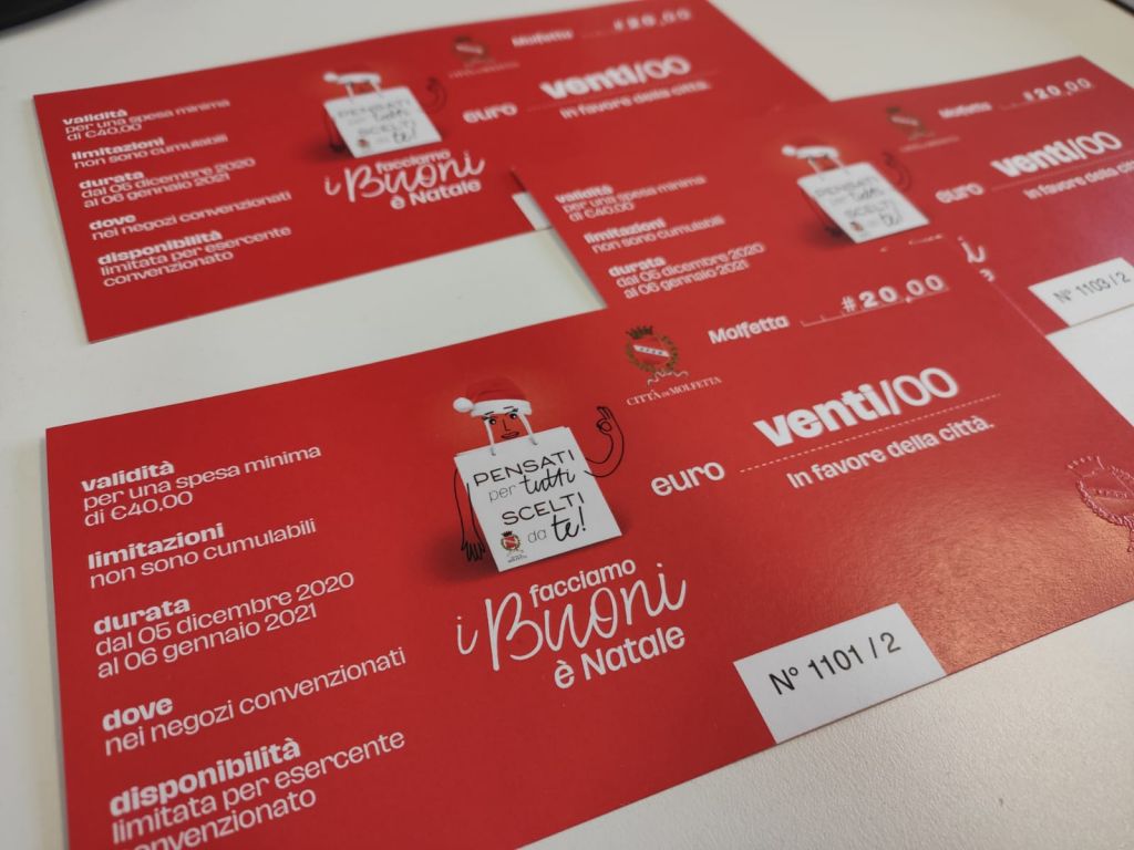 “In un periodo di difficoltà per l’economia e il commercio di prossimità – spiega l’assessore al Commercio Antonio Ancona – mettiamo in circolo, grazie ai buoni, 30mila euro di liquidità con l’obiettivo di moltiplicare questa somma. Con questa iniziativa invitiamo i molfettesi a fare shopping in città: oltre ai nostri buoni, dall’8 dicembre si avrà anche la possibilità, pagando con carte o app, di usufruire del “Cashback” introdotto dal Governo per recuperare un ulteriore 10% sulle spese”.