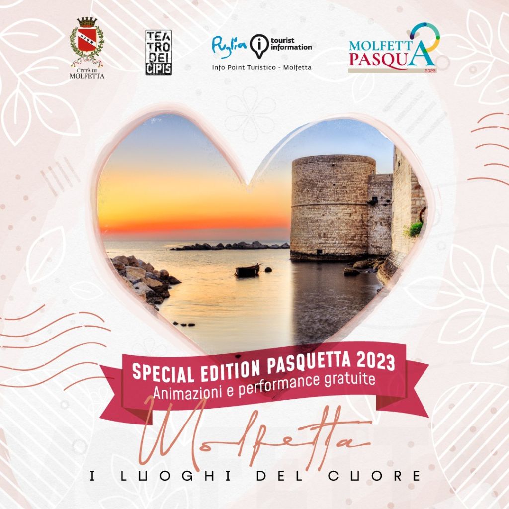 Ma le aperture straordinarie non si fermano qui. Il giorno di Pasqua tutti i siti cittadini saranno regolarmente aperti: Pulo 10-12 e 16-17; Museo Civico 10,30-12,30 e 17,30-19,30; Torrione Passari, Chiesa della Morte e Sala dei templari 10-13 e 18-21. Mentre tornano a Pasquetta, in una veste primaverile, anche le animazioni culturali con l’iniziativa “Molfetta, i luoghi del cuore”.