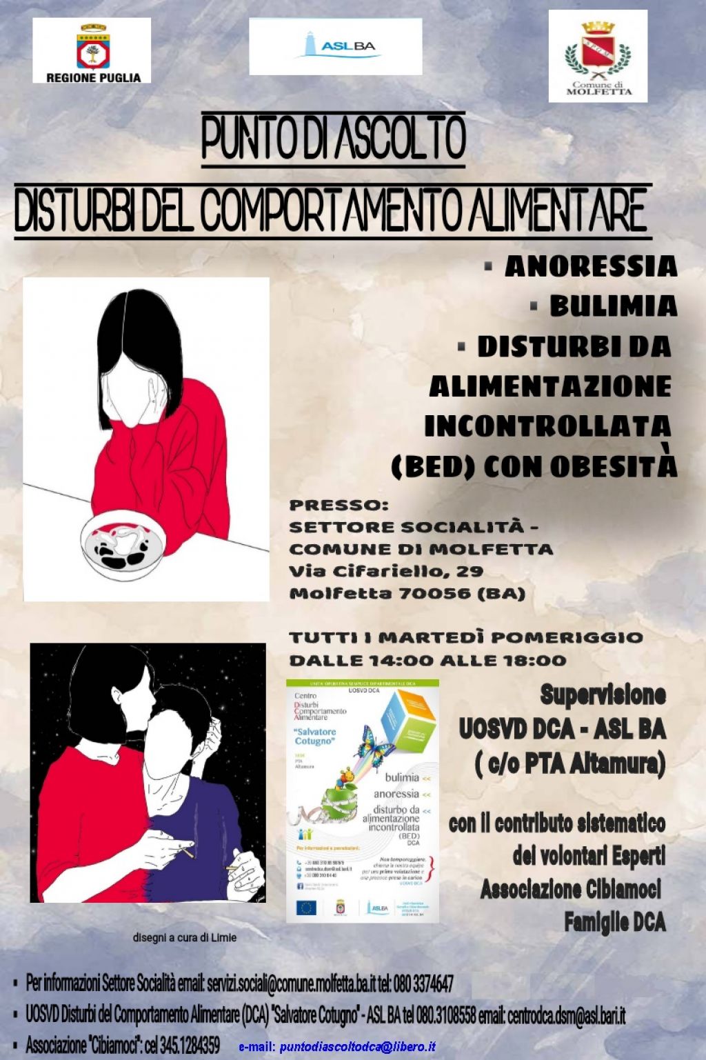Sarà attivo a partire dal 2 marzo, presso gli uffici della socialità, in Via Cifariello, 29, il punto di ascolto per i disturbi derivanti dal comportamento alimentare. Lo sportello, sarà aperto al pubblico tutti i martedì, dalle 14.00 alle 18.00, con la collaborazione di esperti dell’associazione Cibiamoci e di famiglie di persone affette da disturbi dell'alimentazione e supervisionato dall’Unità operativa semplice valenza dipartimentale per i Disturbi del Comportamento alimentare (UOSVD-DCA) della Asl Ba.