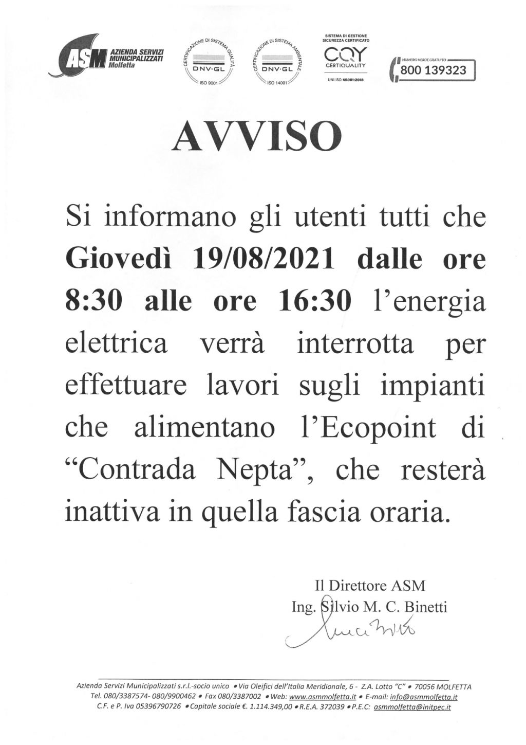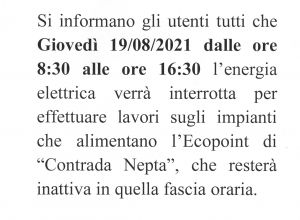ASM - avviso interruzione energia elettrica - Contrada Nepta - giovedì 19 agosto 2021