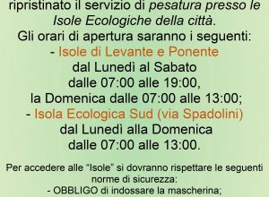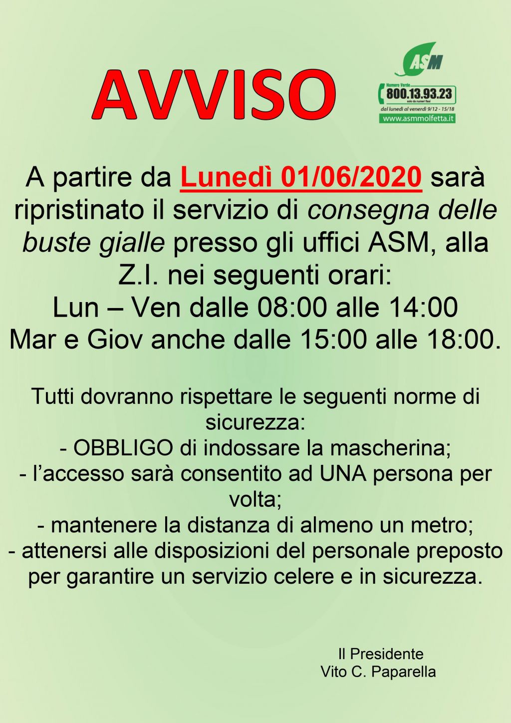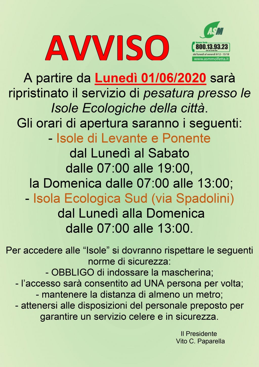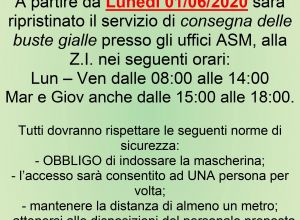 L'ASM comunica all'utenza la riapertura dell'ufficio che effettua la consegna delle buste gialle, gli orari di apertura delle isole ecologiche ed il ripristino del servizio di pesatura dei rifiuti.