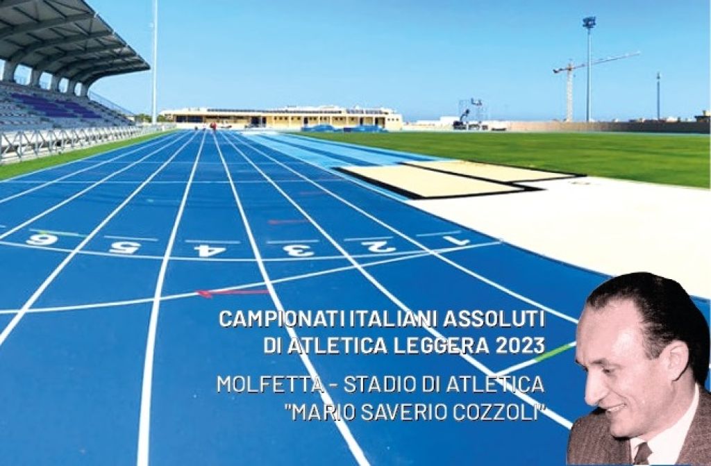In primo piano la pista di atletica con le sue otto corsie, in secondo, il volto di colui che ha dato il nome allo stadio di atletica Mario Saverio Cozzoli.