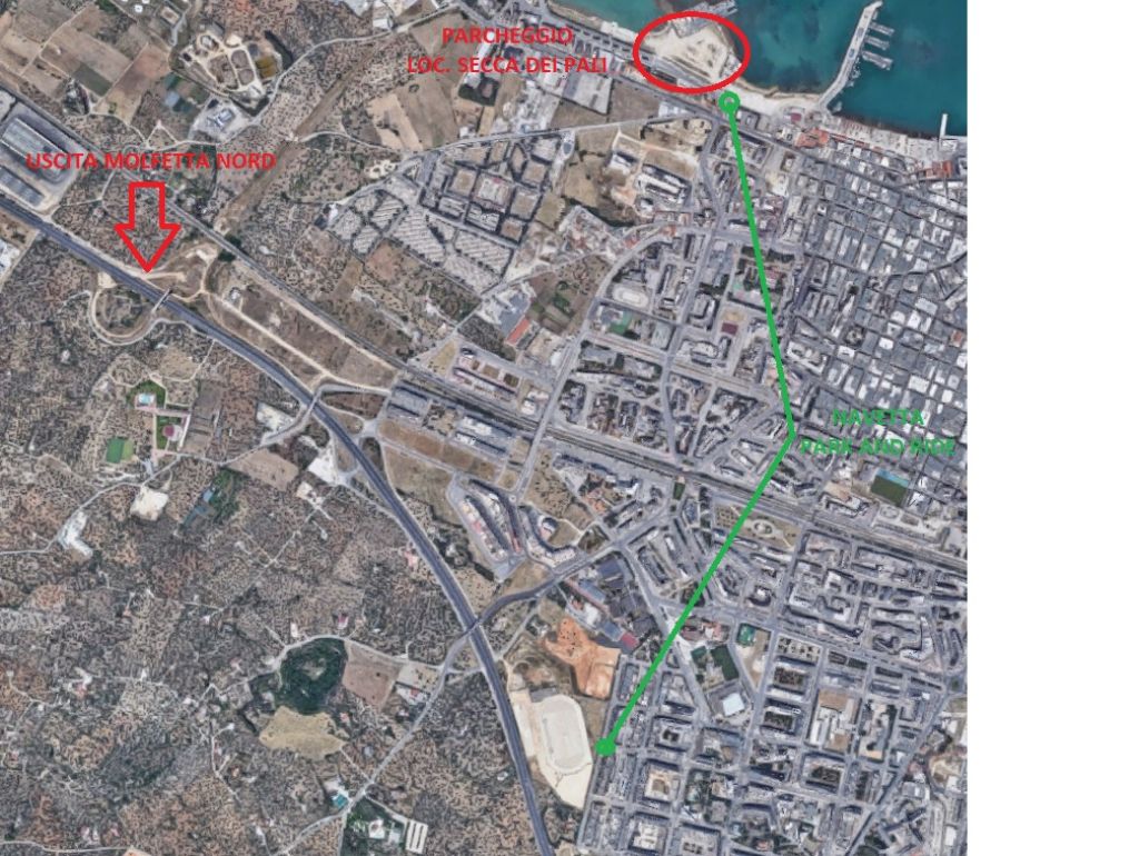 Nei tre giorni di gara capolinea del servizio di park&ride sarà località Secca dei pali con navette garantite ogni dieci minuti circa. Si è scelto di individuare l’area di Secca dei pali per evitare che un numero eccessivo di auto attraversasse la città. L’uscita consigliata per chi viene da fuori è ‘Molfetta nord’ come verrà indicato da apposita segnaletica.