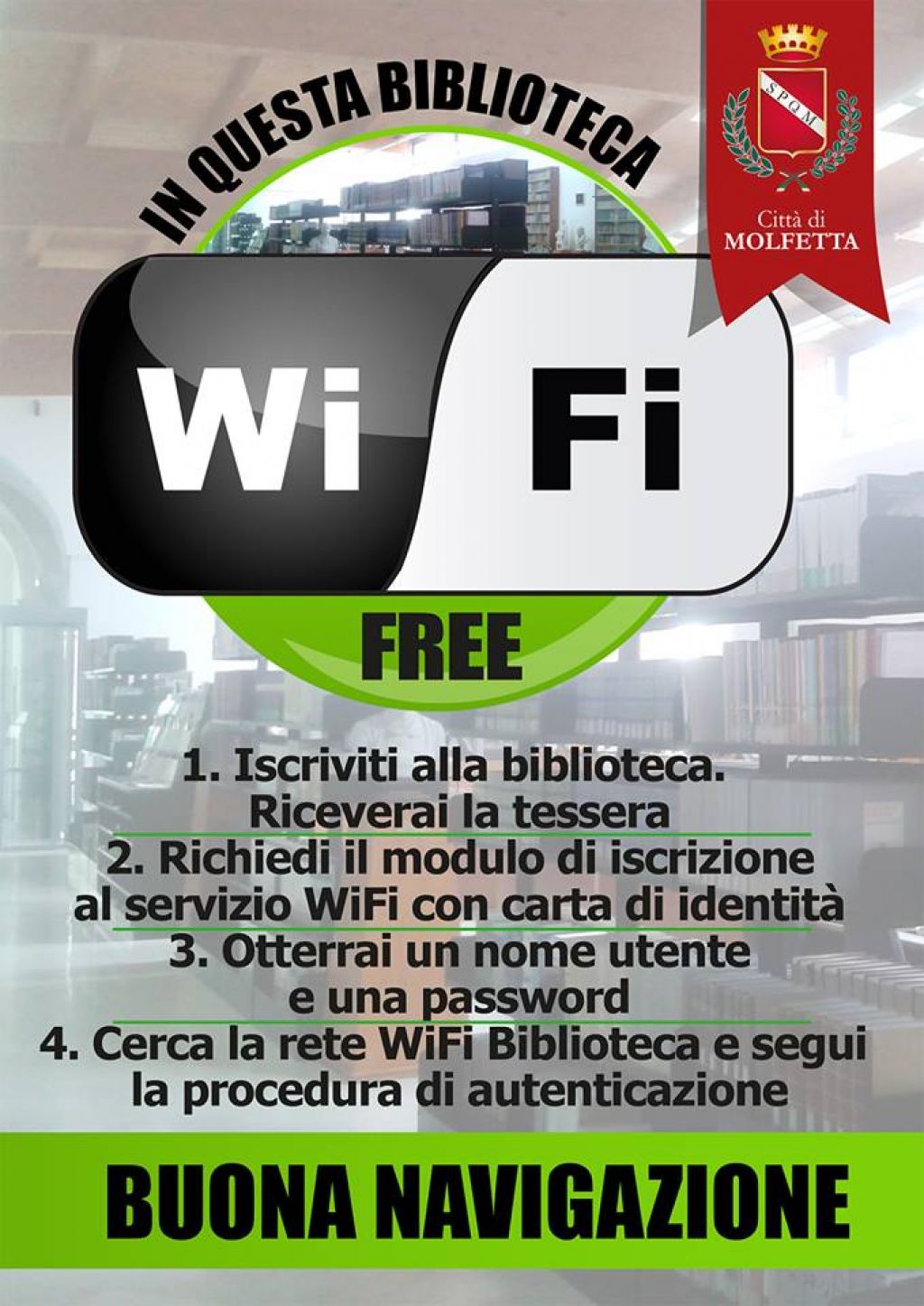 Locandina wifi bibliotecaÈ attivo il sistema di connessione internet wifi nella sala lettura della biblioteca comunale "Giovanni Panunzio".