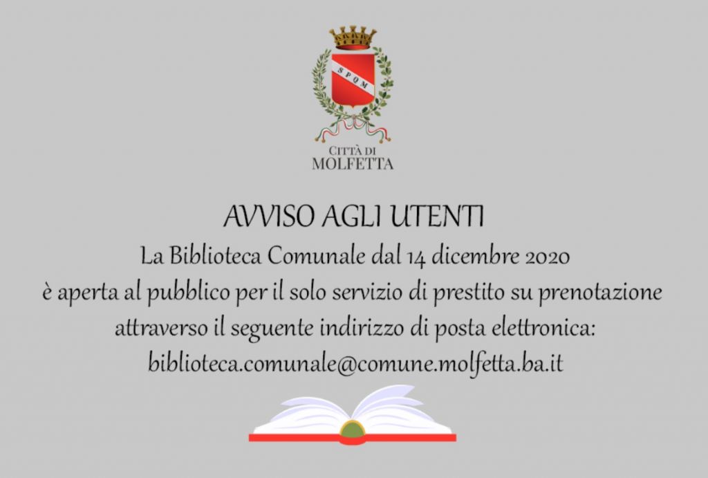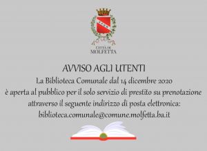 A partire dal 14 dicembre scorso, presso la Biblioteca comuanle, è attivo il servizio di prestito su prenotazione. Quanti volessero accedervi possono scrivere a biblioteca.comunale@comune.molfetta.ba.it