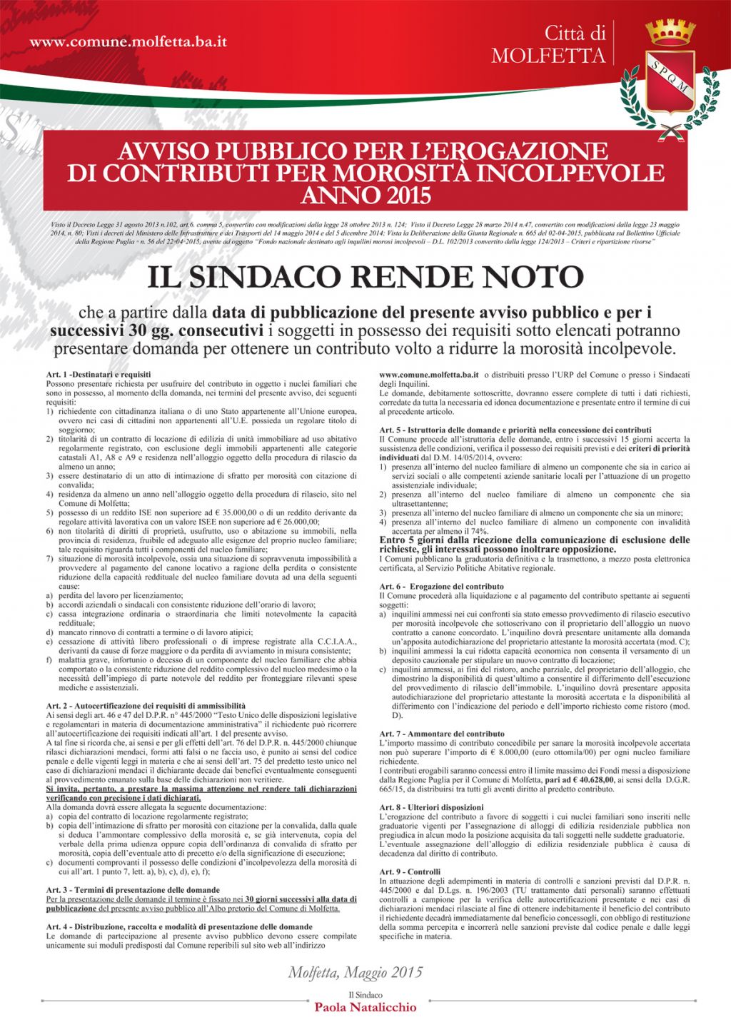 Avviso morosità incolpevoleVisto il Decreto Legge 31 agosto 2013 n.102, art.6. comma 5, convertito con modificazioni dalla legge 28 ottobre 2013 n. 124;Visto il Decreto Legge 28 marzo 2014 n.47, convertito con modificazioni dalla legge 23 maggio 2014, n. 80;Visti i decreti del Ministero delle Infrastrutture e dei Trasporti del 14 maggio 2014 e del 5 dicembre 2014; Vista la Deliberazione della Giunta Regionale n. 665 del 02-04-2015, pubblicata sul Bollettino Ufficiale della Regione Puglia ? n. 56 del 22?04?2015, avente ad oggetto "Fondo nazionale destinato agli inquilini morosi incolpevoli ? D.L. 102/2013 convertito dalla legge 124/2013 ? Criteri e ripartizione risorse"