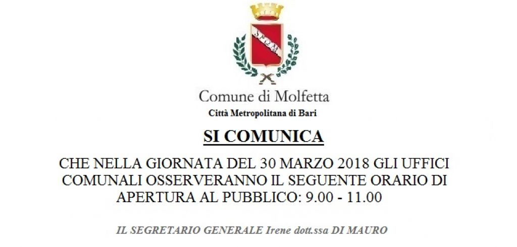 Si comunica che nelle giornate del 30 marzo 2018 gli uffici comunali osserveranno il seguente orario di apertura al pubblico: 9.00 - 11.00.