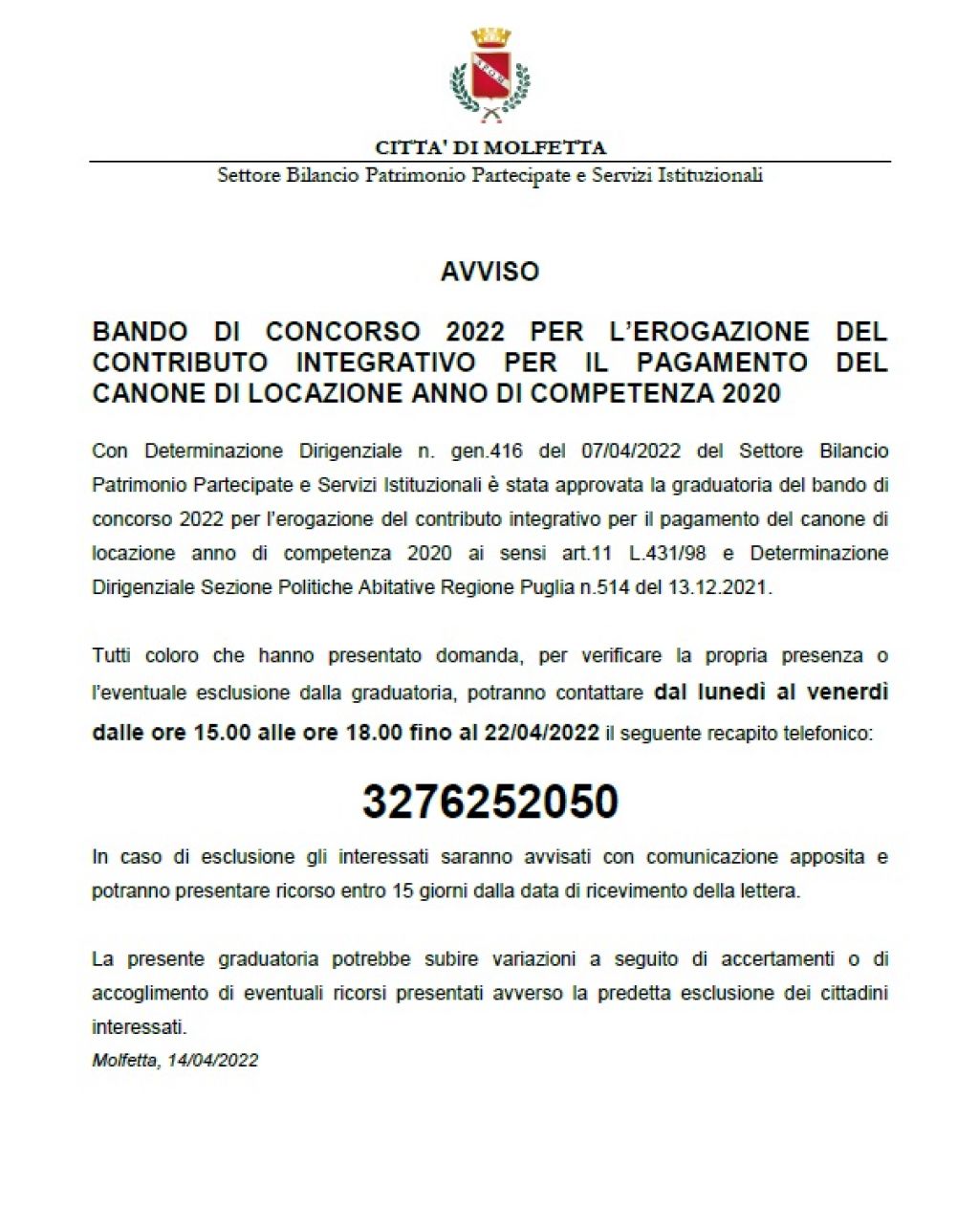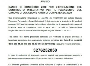 Tutti coloro che hanno presentato domanda, per verificare la propria presenza o l’eventuale esclusione dalla graduatoria, potranno contattare dal lunedì al venerdì, dalle ore 15.00 alle ore 18.00, fino al 22/04/2022 il seguente recapito telefonico: 3276252050