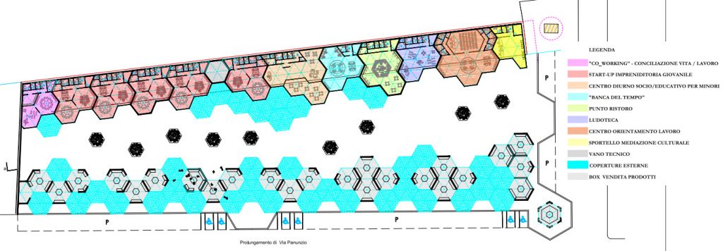 L'architetto Orazio Lisena, in collaborazione con l'ing. Luca Lucanie, con il coordinamento del dirigente Lazzaro Pappagallo, ha elaborato un progetto originale e assai convincente, capace di combinare creatività e funzionalità e di rispondere al doppio obiettivo: mercato e spazi socio-ricreativi. L'ispirazione architettonica, assai suggestiva, è quella di un alveare, con esagoni componibili che costituiscono dapprima una "L" edificata, con all'interno gli spazi socio-lavorativi e, nell'ampio spazio di fronte, un'area coperta con tettoia nella quale sono innestati i 24 box commerciali. Nella cinta dell'area vengono guadagnati circa 50 stalli di parcheggio, legati ad alcuni abbattimenti murari.