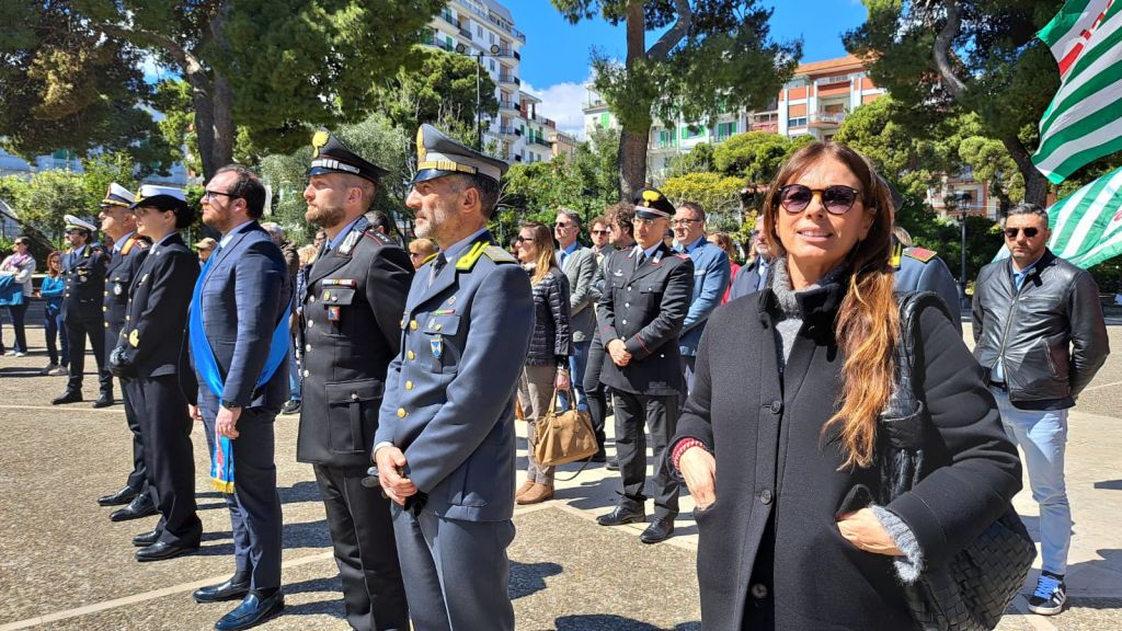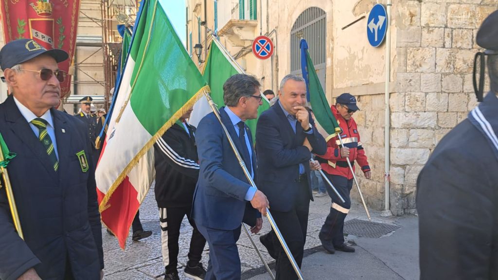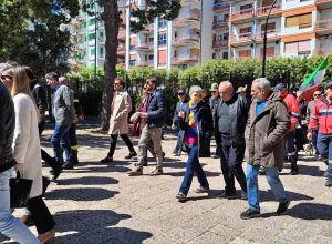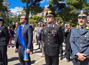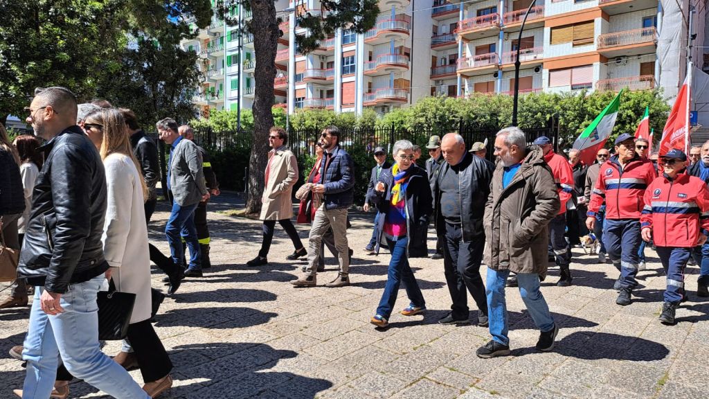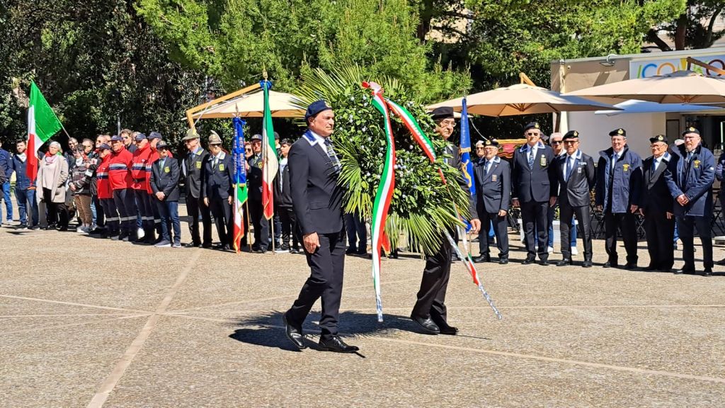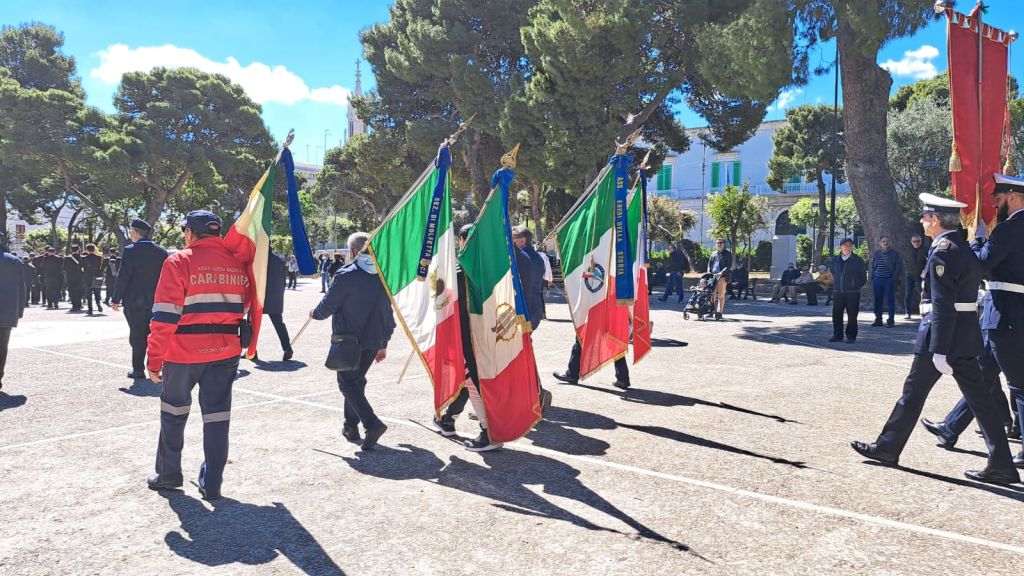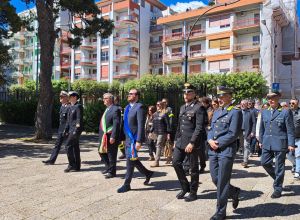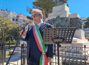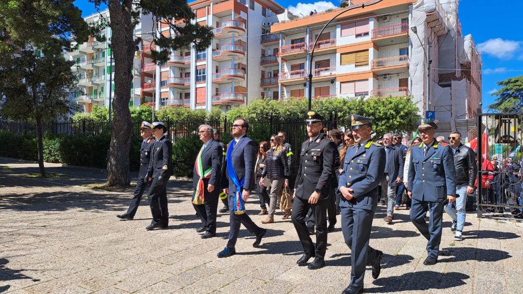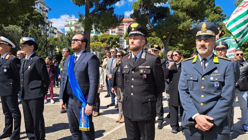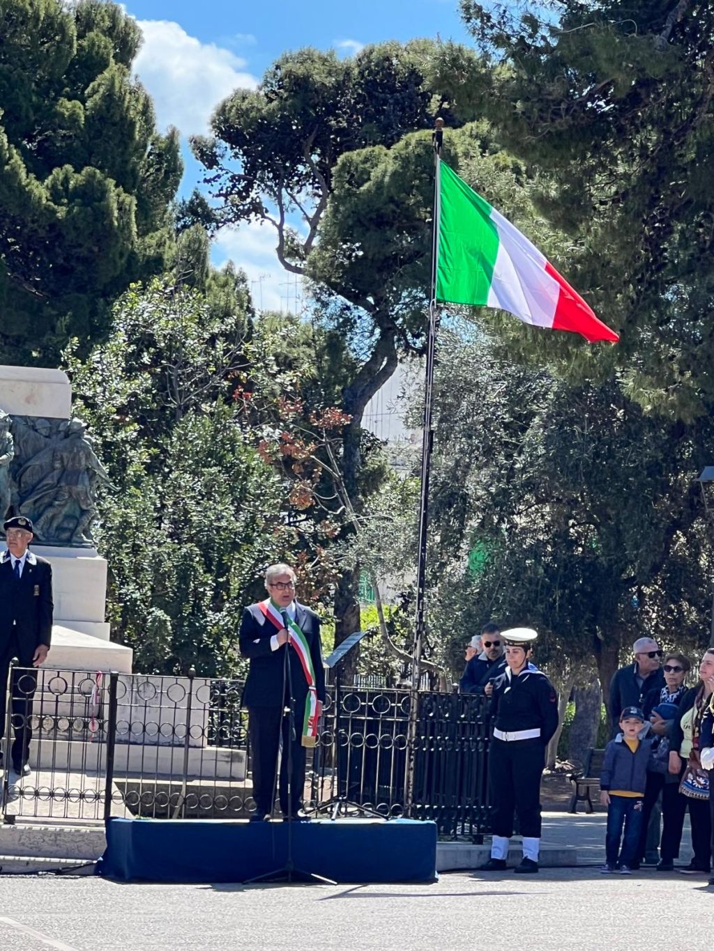 Così il Sindaco Tommaso Minervini nel discorso in occasione delle celebrazioni del 25 aprile. Alle sue spalle il Monumento ai Caduti di tutte le guerre, tutto intorno i rappresentanti delle associazioni combattentistiche e d’armi, delle Forze dell’ordine, dei sindacati, delle associazioni, gente comune, numerosa, della Giunta, del Consiglio comunale.