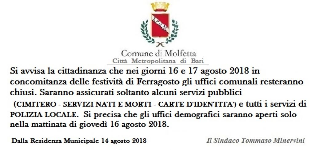 Chiusura degli uffici comunali per i giorni 16 e 17 agosto 2018