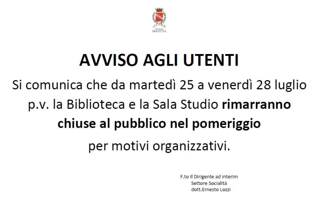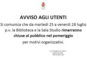 A partire da oggi, 25 luglio, e fino a venerdì 28 luglio incluso, la Biblioteca comunale "Panunzio" e la Sala studio presso la Biblioteca, nel pomeriggio, resteranno chiuse.