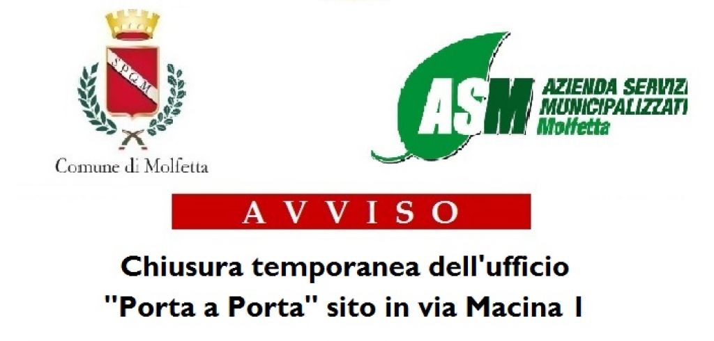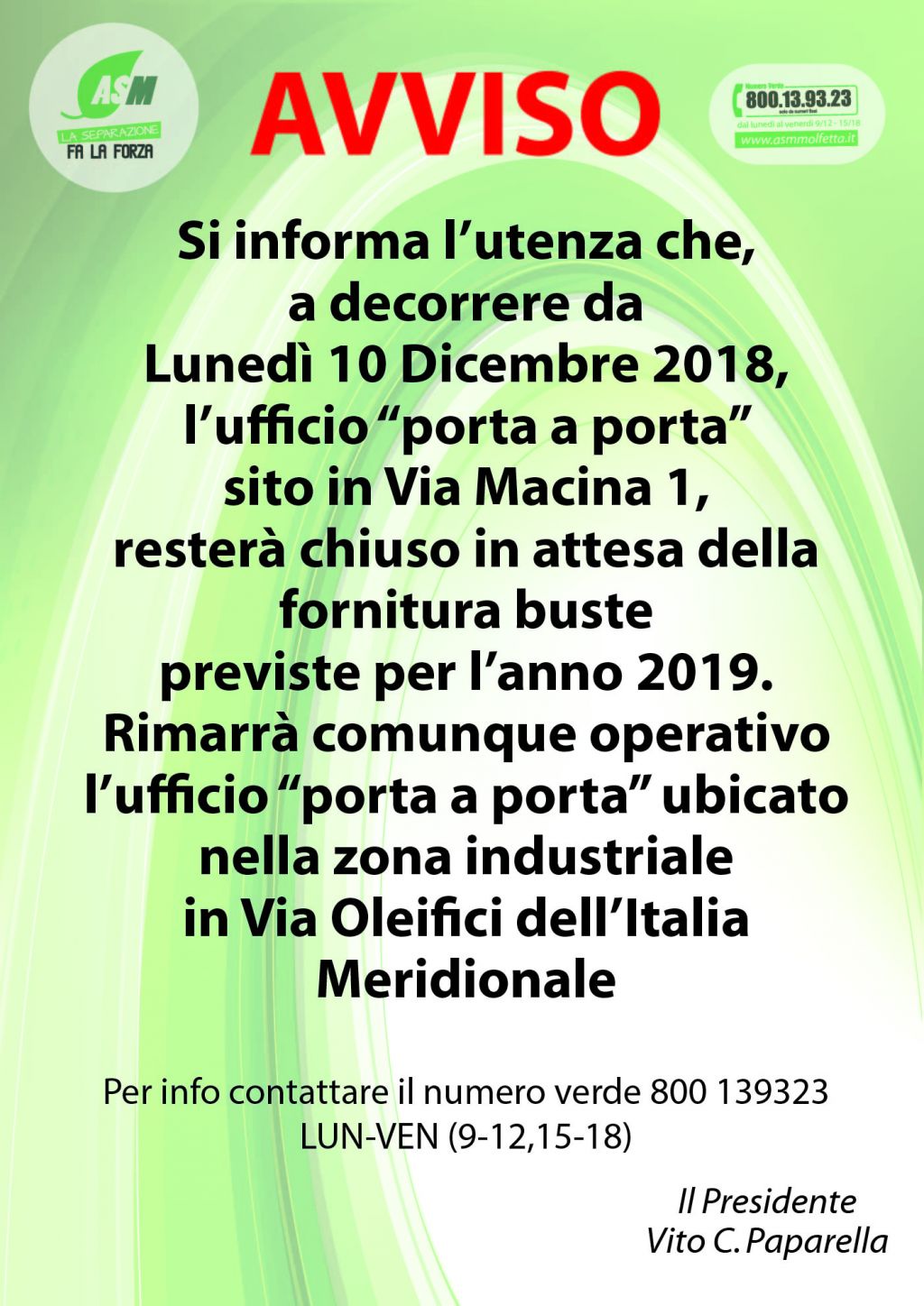 Chiusura temporanea dell'ufficio "Porta a Porta" sito in via Macina I