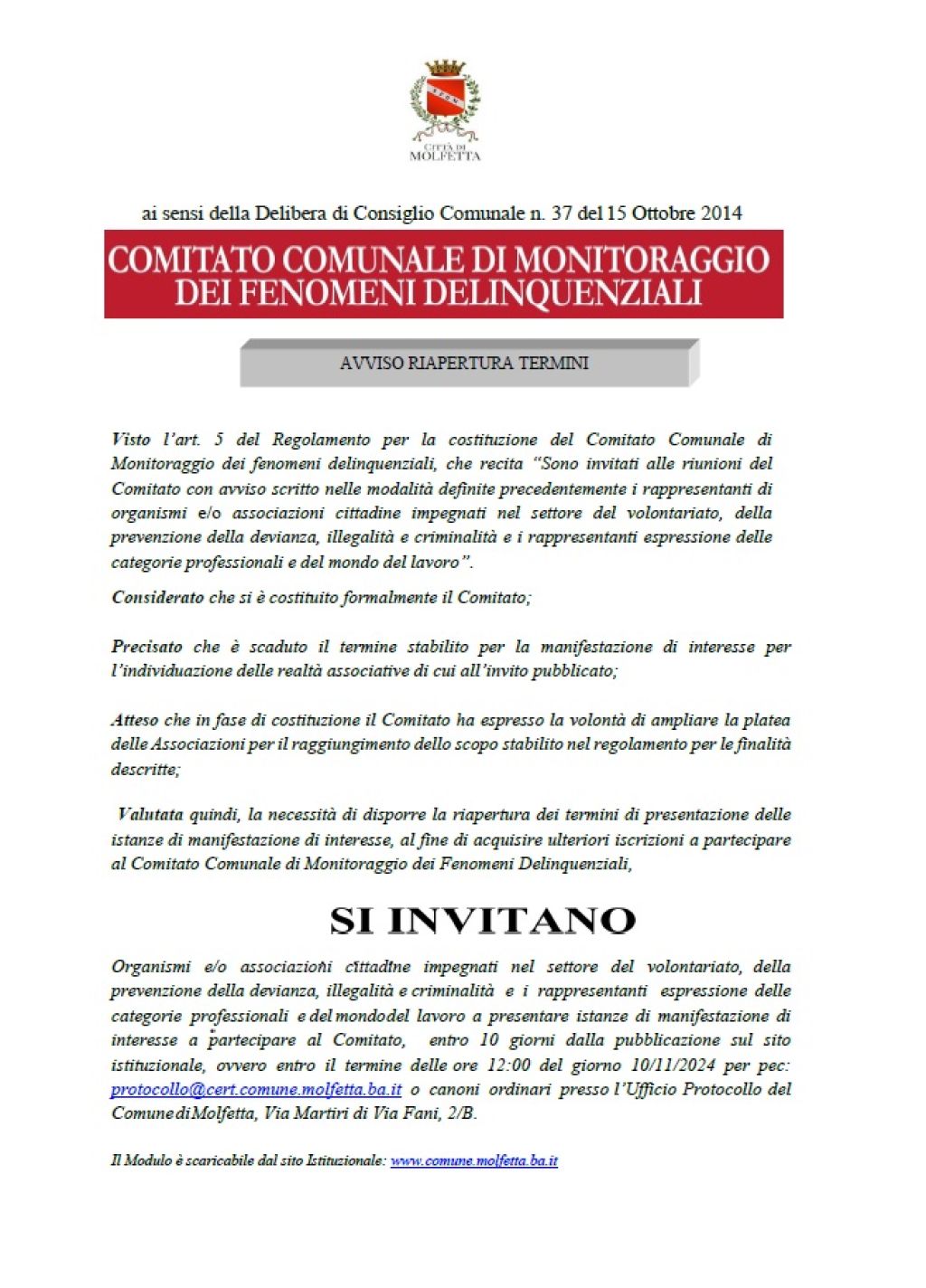 Si invitano Organismi e/o associazioni cittadine impegnati nel settore del volontariato, della prevenzione della devianza, illegalità e criminalità e i rappresentanti espressione delle categorie professionali e del mondo del lavoro a presentare istanze di manifestazione di interesse a partecipare al Comitato, entro 10 giorni dalla pubblicazione sul sito istituzionale, ovvero entro il termine delle ore 12:00 del giorno 10/11/2024 per pec: protocollo@cert.comune.molfetta.ba.it o canoni ordinari presso l’Ufficio Protocollo del Comune di Molfetta, Via Martiri di Via Fani, 2/B.