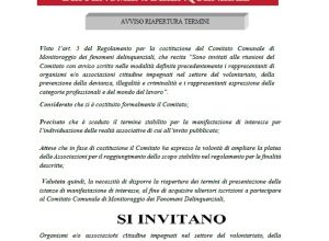 Comitato comunale di monitoraggio dei fenomeni delinquenziali. Avviso riapertura termini