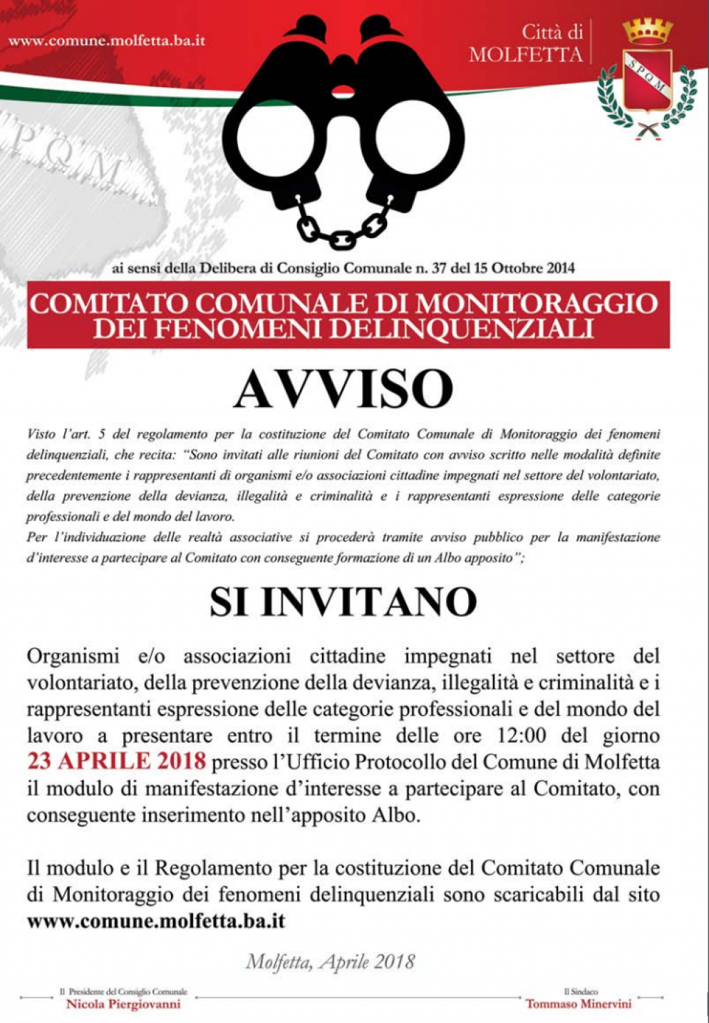 Organismi e/o associazioni cittadine impegnati nel settore del volontariato, della prevenzione della devianza, illegalità e criminalità e i rappresentanti espressione delle categorie professionali e del mondo del lavoro a presentare entro il termine delle ore 12:00 del giorno 23 APRILE 2018 presso l'Ufficio Protocollo del Comune di Molfetta il modulo di manifestazione d'interesse a partecipare al Comitato, con conseguente inserimento nell'apposito Albo.