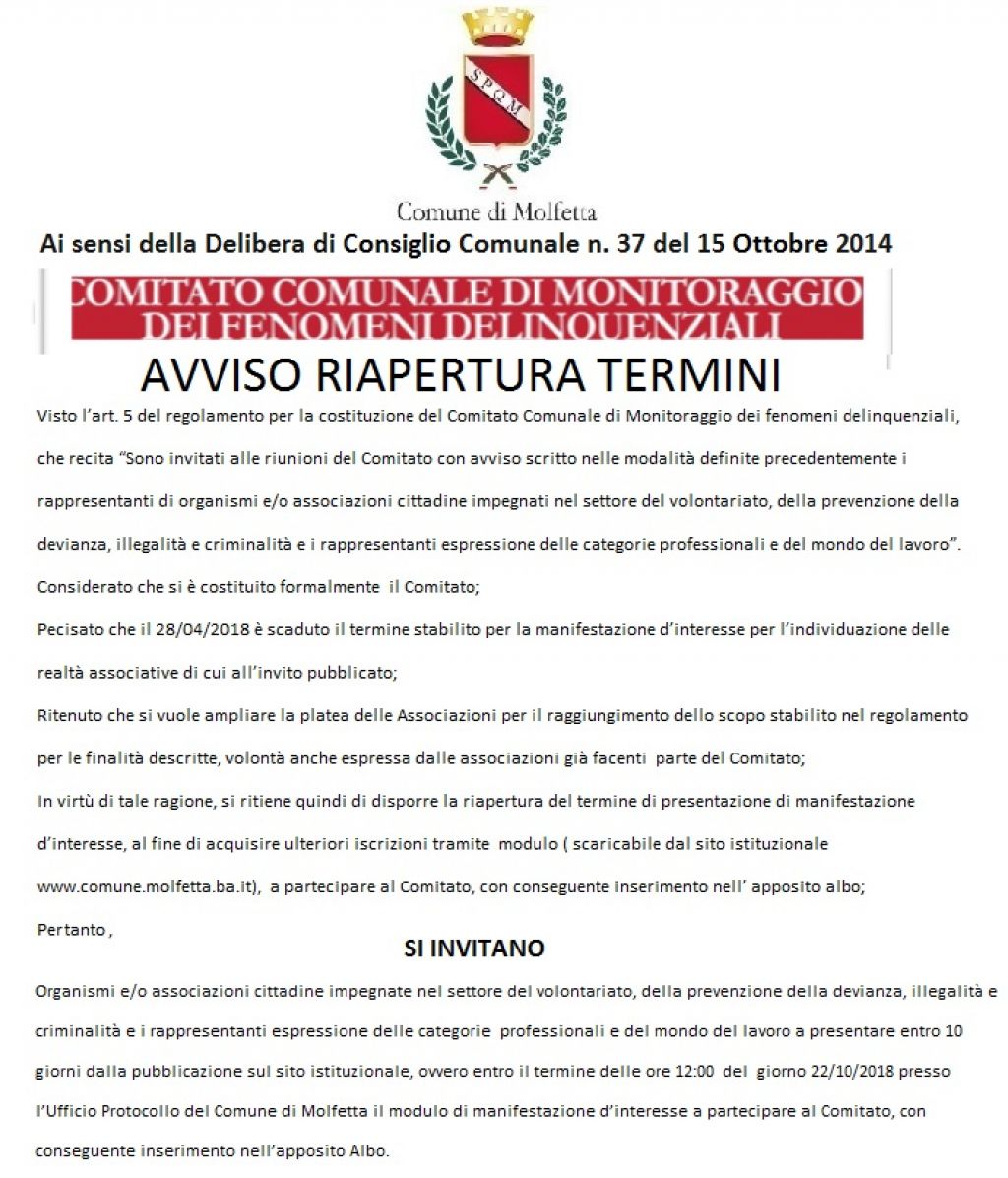 Comitato comunale di monitoraggio dei fenomeni delinquenziali comune di Molfetta 12 10 2018