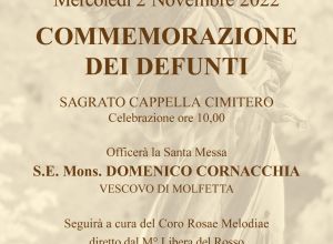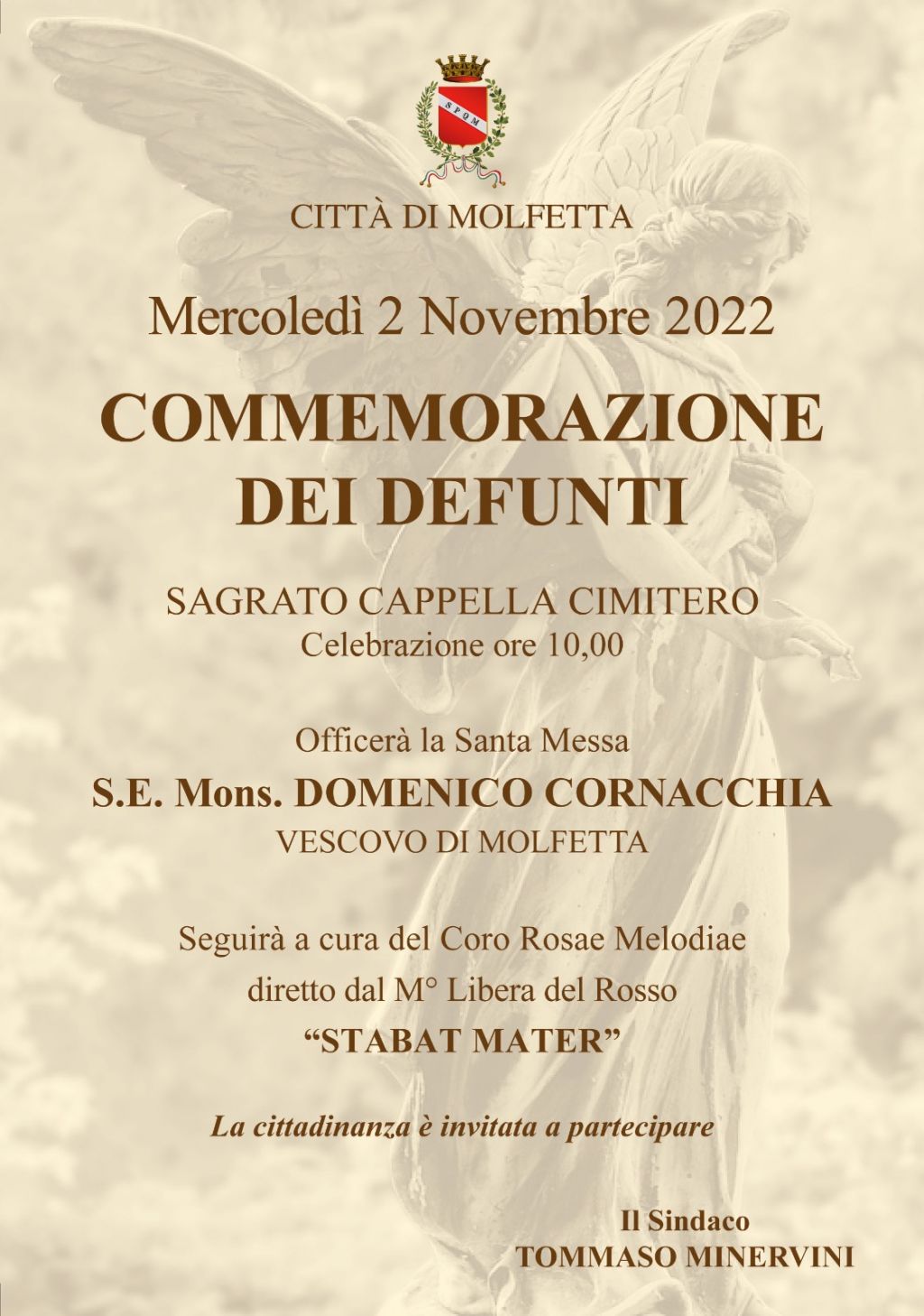 Alle ore 10, sul Sagrato della Cappella del Cimitero, il vescovo della Diocesi, monsignor Domenico Cornacchia, officerà la Santa Messa. Sarà presente il Sindaco, Tommaso Minervini.