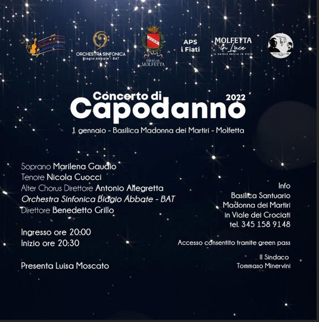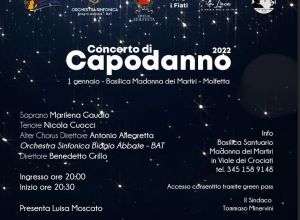Concerto di Capodanno nella Basilica Madonna dei martiri, sabato 1 gennaio 2022, alle ore 20.30, nell’ambito di “Molfetta in luce”, rassegna di eventi predisposta in occasione delle festività di fine anno dal Comune di Molfetta (assessorati al Marketing territoriale e Cultura) e dal Distretto urbano del commercio.