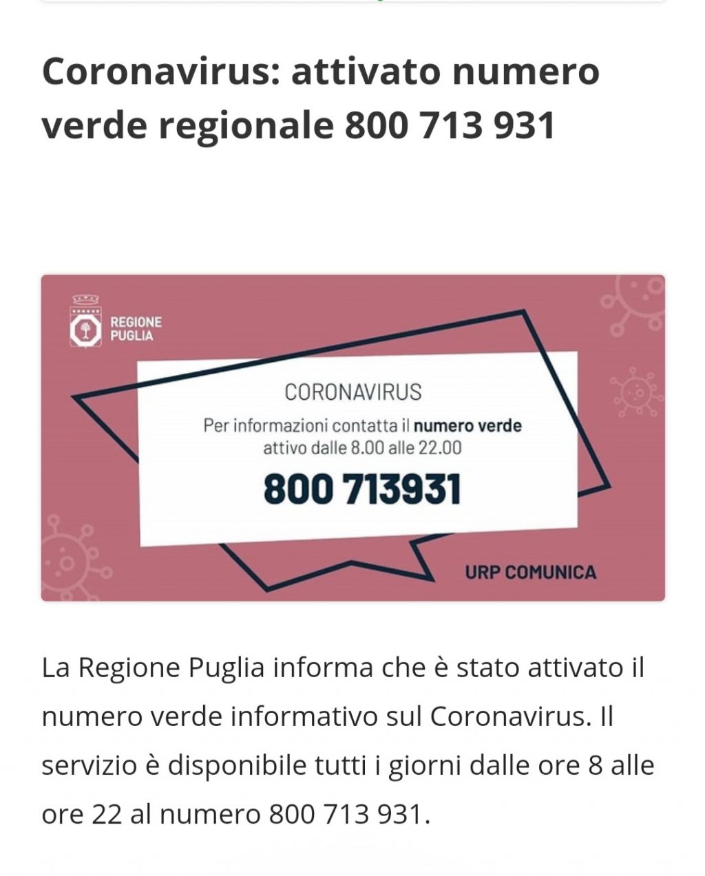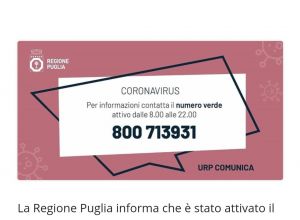 E' stato attivato il numero verde regionale 800 713931 per ricevere informazioni sul Coronavirus. Il numero è disponibile tutti i giorni dalle ore 8 alle ore 22.