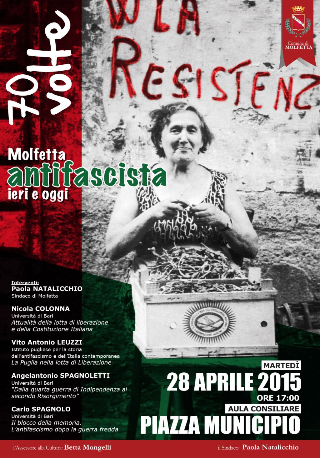 In occasione di questo anniversario l'assessorato alla cultura con la consulenza scientifica del prof. Angelantonio Spagnoletti ha organizzato una giornata di studi che avrà luogo il 28 aprile a partire dalle ore 17 nella sala consigliare di Palazzo Giovene dal titolo: "70 volte resistenza. Molfetta antifascista ieri e oggi". Interverranno Nicola Colonna dell'Università di Bari sull'attualità della lotta di Liberazione e della Costituzione Italiana; Vito Antonio Leuzzi dell'Istituto pugliese per la storia dell'antifascismo e dell'Italia contemporanea sulla Puglia nella lotta di Liberazione; Angelantonio Spagnoletti dell'Università di Bari sul tema "Dalla quarta guerra di Indipendenza al secondo Risorgimento"; Carlo Spagnolo dell'Università di Bari sul tema "Il blocco della memoria. L'antifascismo dopo la guerra fredda". Concluderanno i lavori l'assessore alla cultura Betta Mongelli e il sindaco di Molfetta Paola Natalicchio.