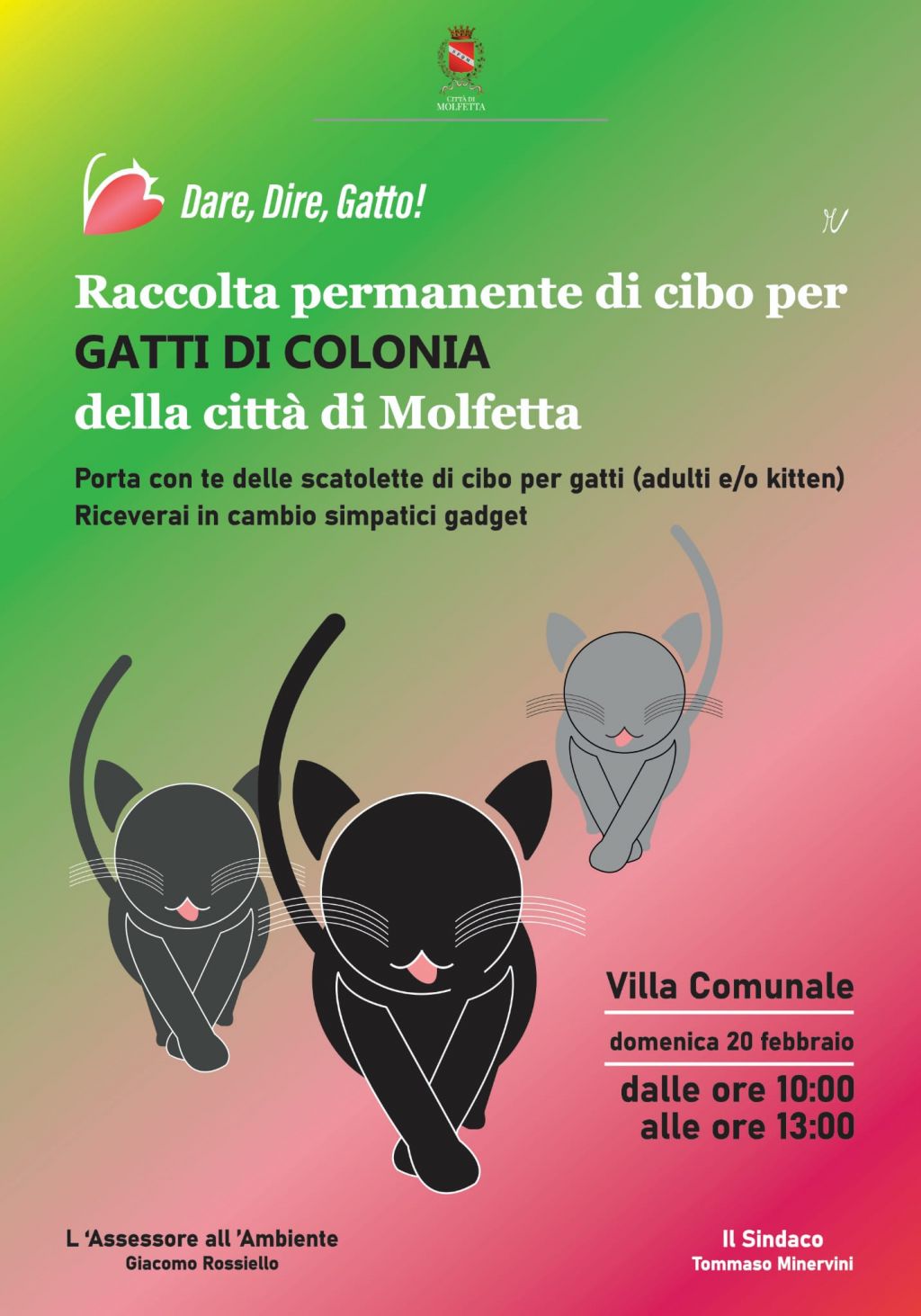 Una raccolta di cibo permanente per aiutare quanti si prendono cura delle colonie feline presenti sul territorio comunale. Con l’iniziativa Dare, dire, gatto, Molfetta celebra la Festa nazionale del gatto, domenica 20 febbraio, dalle 10 alle 13, nella villa comunale.