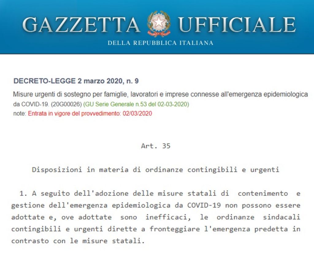 Decreto Coronavirus: disposizioni sulle ordinanze sindacali