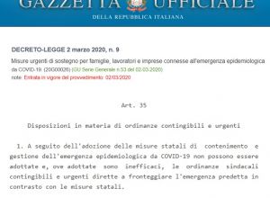 A specificarlo è l’articolo 35 del Decreto Legge 2 marzo 2020 n.9 “Misure urgenti di sostegno per famiglie, lavoratori e imprese connesse all’emergenza epidemiologica da COVID-19”, pubblicato sulla Gazzetta Ufficiale.