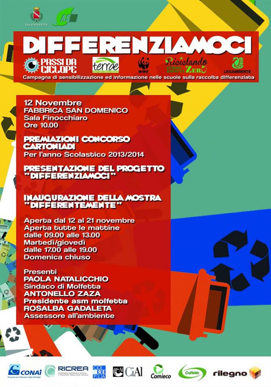 "Differenziamoci", è questo il nome del progetto scolastico, dedicato all'ambiente, alla corretta gestione dei rifiuti in particolare, voluto fortemente dall'Asm e dall'Amministrazione comunale, realizzato con la preziosa collaborazione dei consorzi di filiera (Corepla, Coreve, Cial, Ricrea, Rilegno, Comieco) e delle associazioni ambientali presenti sul territorio (Terrae, Wwf, Riciclando verso zero rifiuti, Passi da Ciclope e Legambiente).La nuova campagna di sensibilizzazione, verrà lanciata mercoledì 12 Novembre presso la Sala Finocchiaro. Nel Chiostro di San Domenico verrà allestita la mostra "differentemente" che rimarrà per 10 giorni durante i quali tutti potranno visitarla negli orari e giorni del chiostro stesso (tutte le mattine dalle ore 9 alle ore 13, martedì e giovedì anche dalle 15 alle 17).