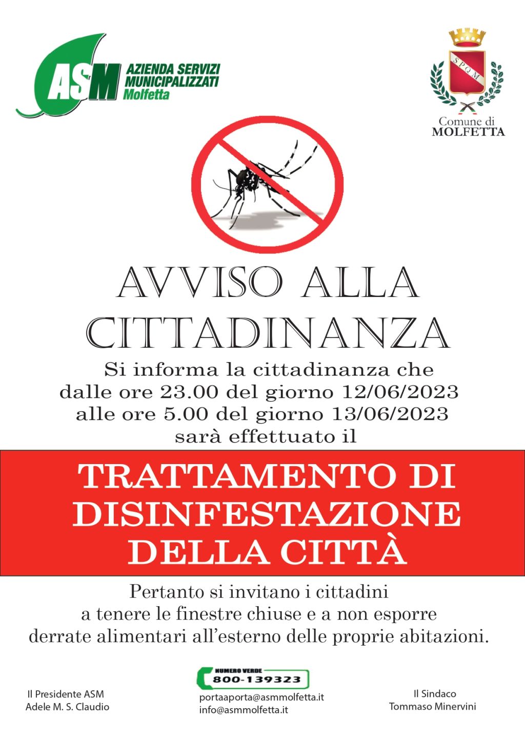 Dalle 23 del 12 giugno alle 5 del 13 giugno prossimo l'Asm provvederà alla disinfestazione della città. Pertanto, nelle ore interessate dall'intervnto, è opportuno non esporre derrate alimentari.