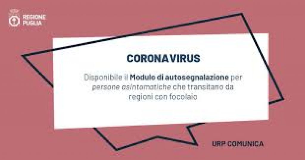 Si prega di compilare questo modulo sul sito della Regione Puglia. A ciò dovrà seguire la quarantena obbligatoria. Ogni violazione delle disposizioni del DPCM e del Decreto del Presidente della Giunta regionale comporta una responsabilità penale ai sensi dell'art. 650 c.p., punibile con l'arresto e l'ammenda.