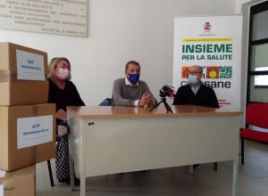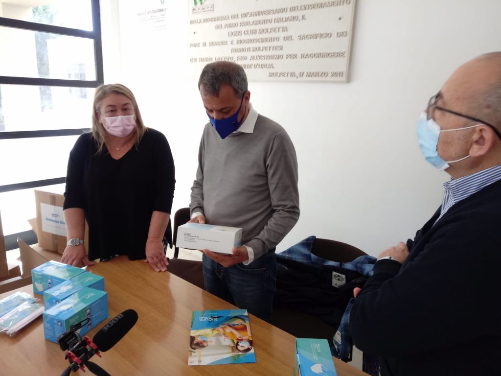 Diecimila mascherine chirurgiche e mille tamponi antigenici sono stati donati, nel corso di una breve cerimonia, al Comune di Molfetta. Presenti il consigliere comunale delegato del Sindaco per l’emergenza Covid, Pasquale Mancini, l’assessore all’igiene e vice presidente della rete italiana Città Sane, Ottavio Balducci, la titolare dell’azienda Consfru, che ha effettuato la donazione, Anna Introna, a cui vanno i ringraziamenti del Sindaco e di tutta l’Amministrazione.