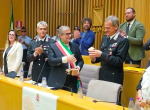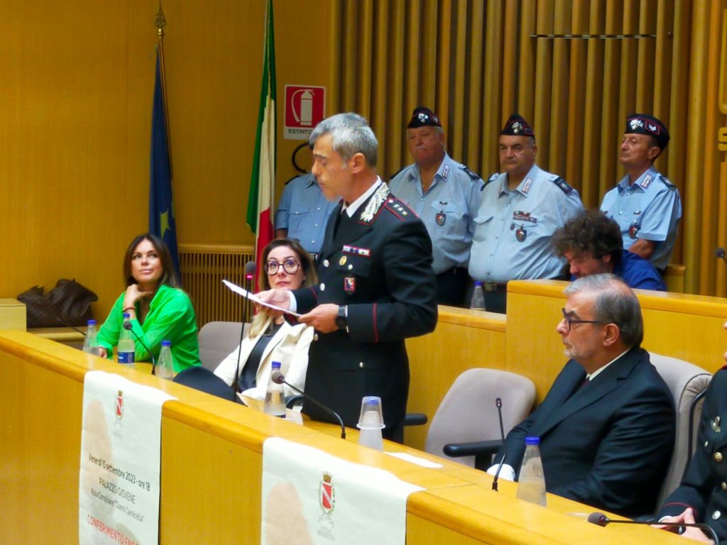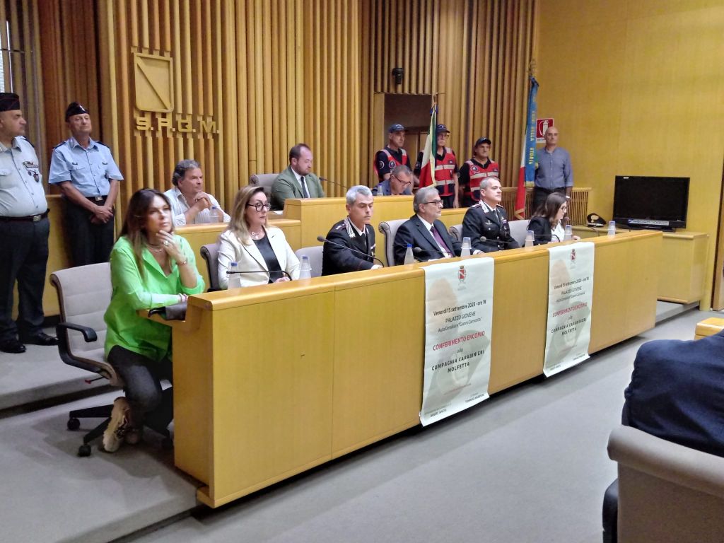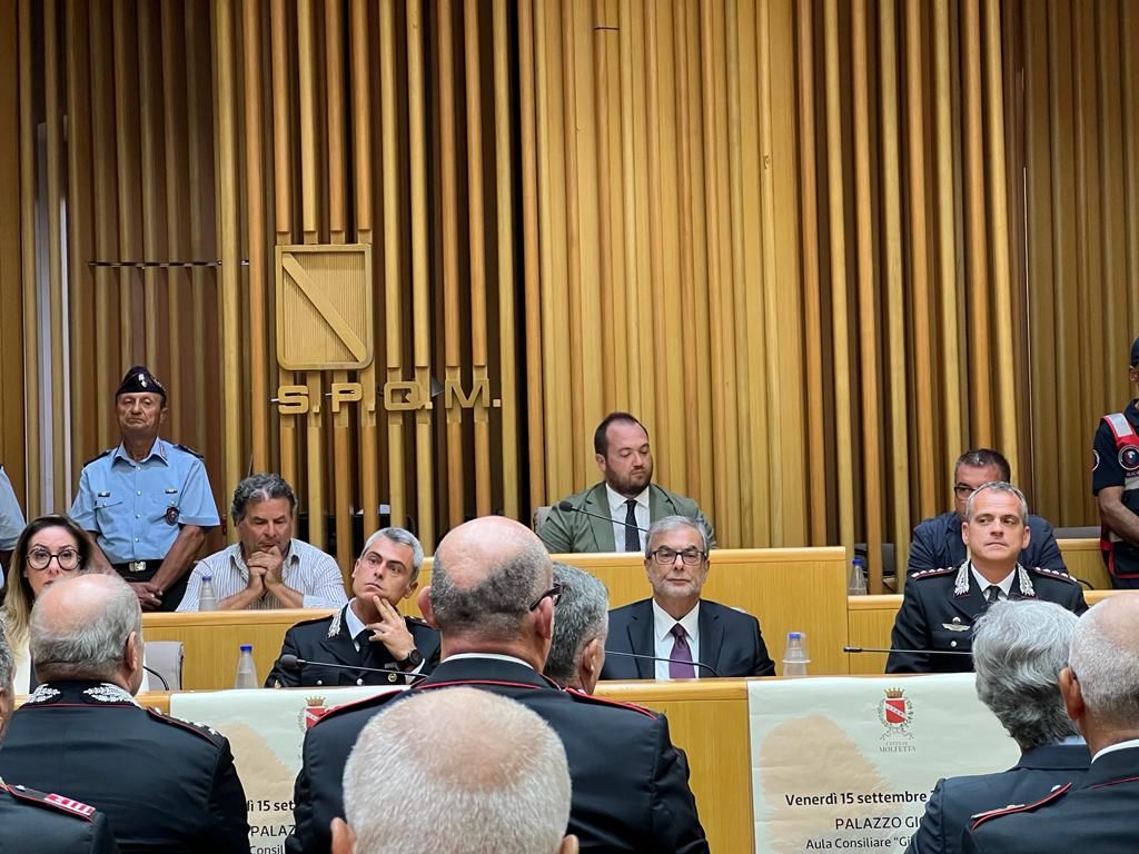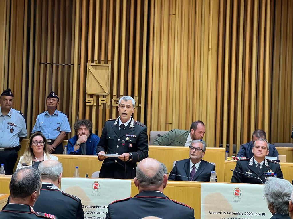 L’Aula consiliare di Palazzo Giovene ha ospitato la cerimonia di consegna dell’encomio alla Compagnia carabinieri Molfetta per il lavoro svolto negli ultimi anni. A ritirarlo il Capitano Iodice, ormai prossimo al trasferimento in altro comune per ricoprire nuovi e prestigiosi incarichi, che ha ricostruito l’azione quotidiana svolta da tutti i reparti della Compagnia impegnati, oltre che in azioni di contrasto e di prevenzione di azioni criminali, in progetti con il Settore socialità del Comune, in indagini articolate, anche in interventi di riappacificazione nella ostilità tra adolescenti, litigiosità di tutti i giorni, controversie familiari.