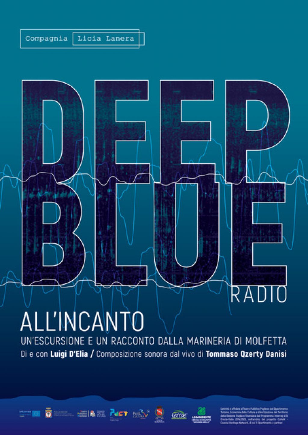 Mercoledì 6 ottobre, nella sala conferenze della sede municipale di Lama Scotella, in via Martiri di Via Fani, alle 10.30, sarà presentato il progetto “Deep Blue Radio: all’incanto” di e con Luigi D’Elia, con composizione sonora di Tommaso Qzerty Danisi, una produzione Compagnia Licia Lanera, una escursione teatrale che si terrà a Cala San Giacomo sabato 9 ottobre, ore 16.30, e domenica 10 ottobre, ore 11.30.