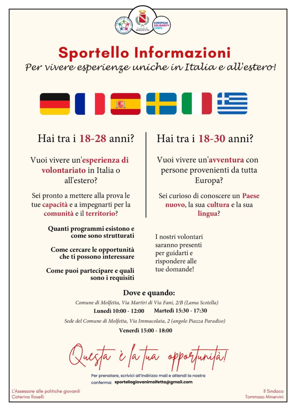 È operativo presso gli uffici comunali in Via Martiri di Via Fani e di Via Immacolata lo Sportello riservato a tutti coloro che necessitano di informazioni per accedere ai programmi del Corpo Europeo di solidarietà, del Servizio civile universale e ai programmi Erasmus+.