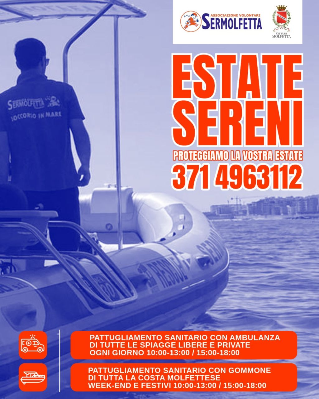 Dal 15 maggio a 31 agosto prossimo lungo le spiagge libere torna il servizio di salvataggio, assistenza sanitaria e attività di formazione-prevenzione, realizzato da SerMolfetta, Misericordia e AVS Molfetta, finanziato dal Comune.